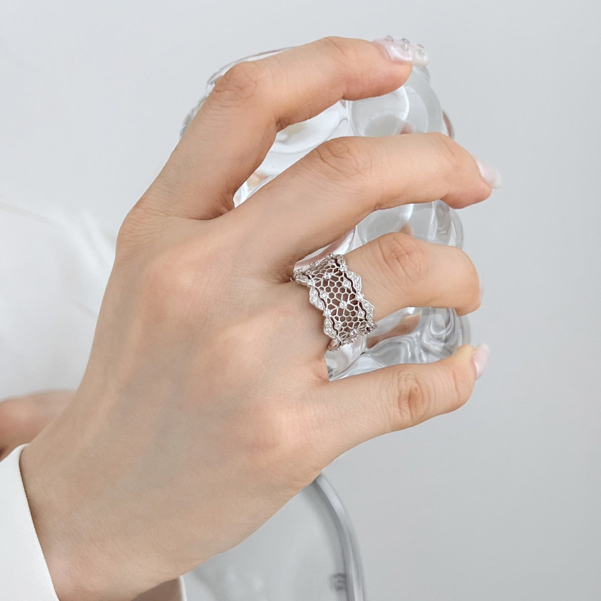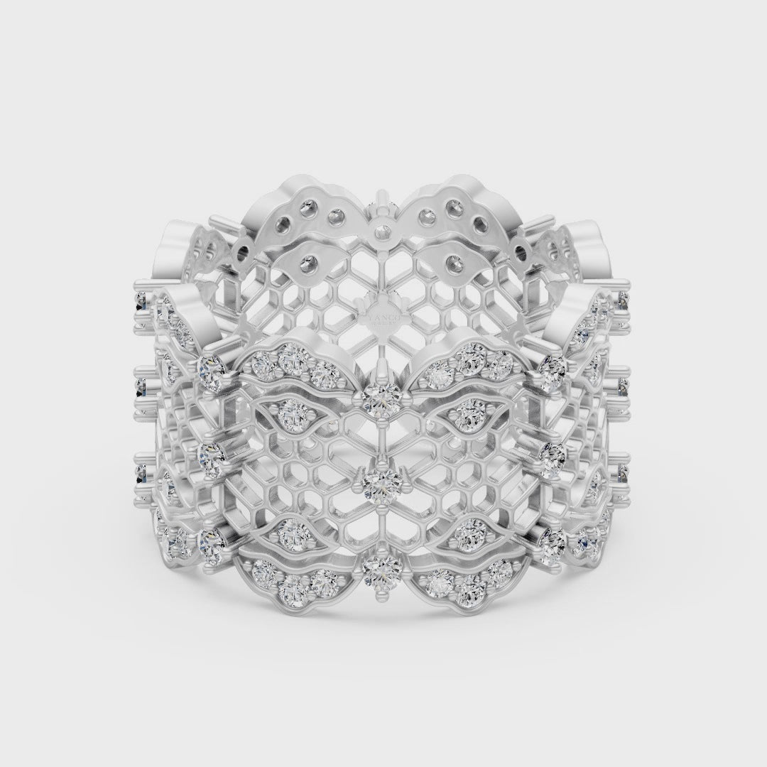The Regal Lace Ring features an intricate lace-inspired design, crafted with precision to mimic the delicate beauty of fine embroidery. Encrusted with shimmering cubic zirconia across a wide, scalloped band, this statement piece captures the essence of timeless luxury.