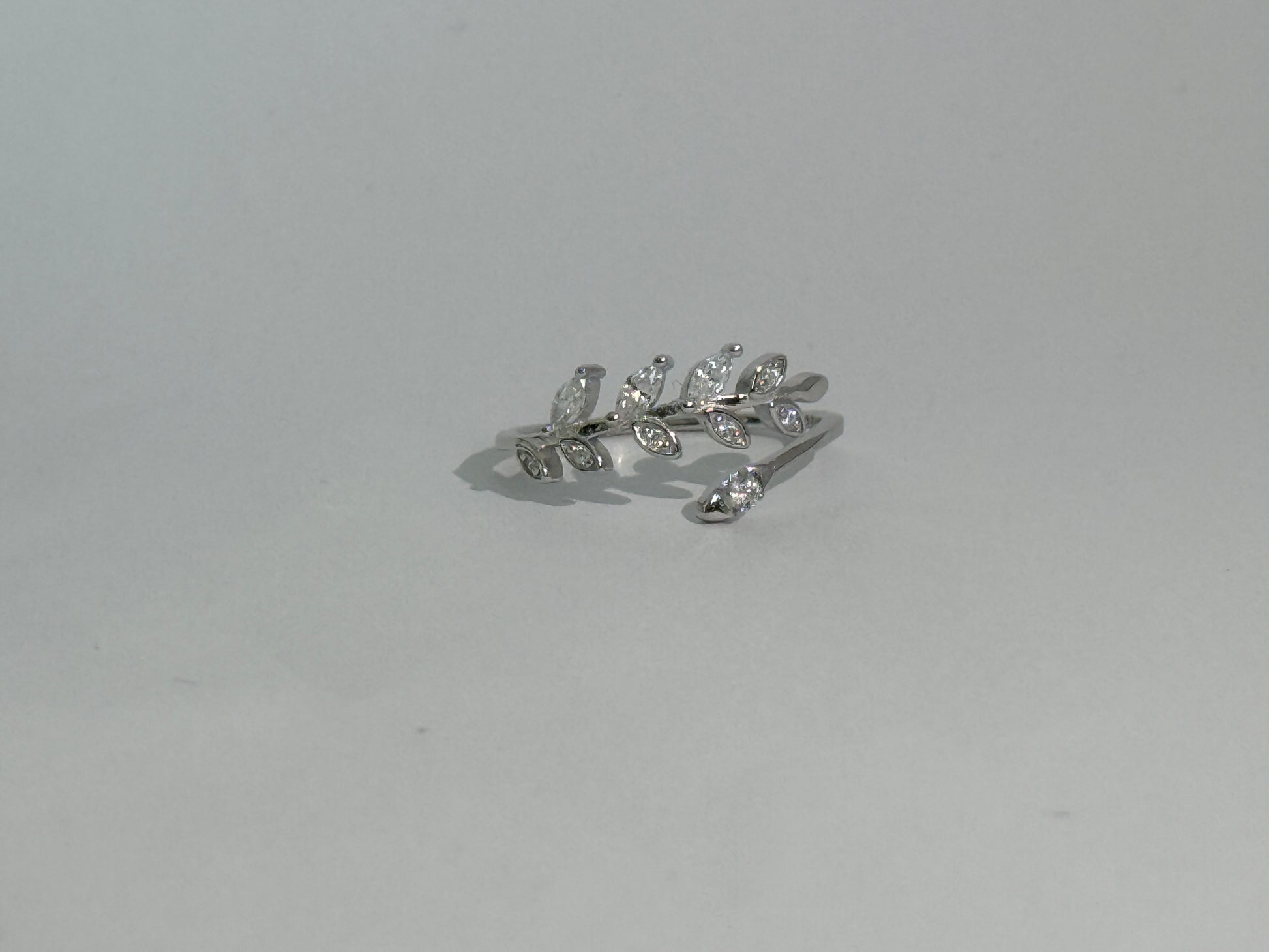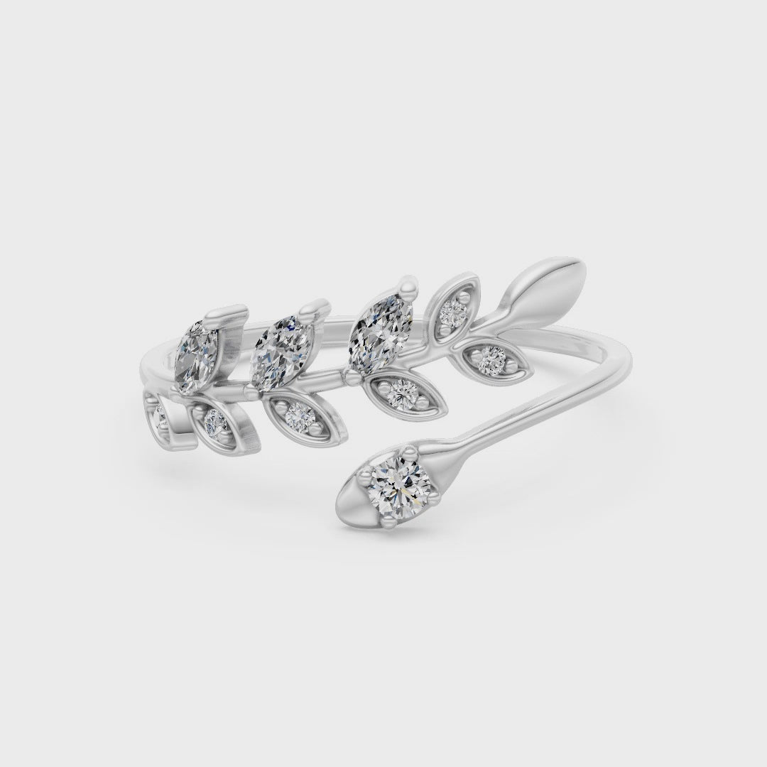 Inspired by nature’s quiet beauty, the Olive Branch Ring wraps delicately around your finger with shimmering grace. Featuring marquise- and pear-cut stones arranged like glistening leaves on a vine, this open-band design offers a soft yet striking statement.